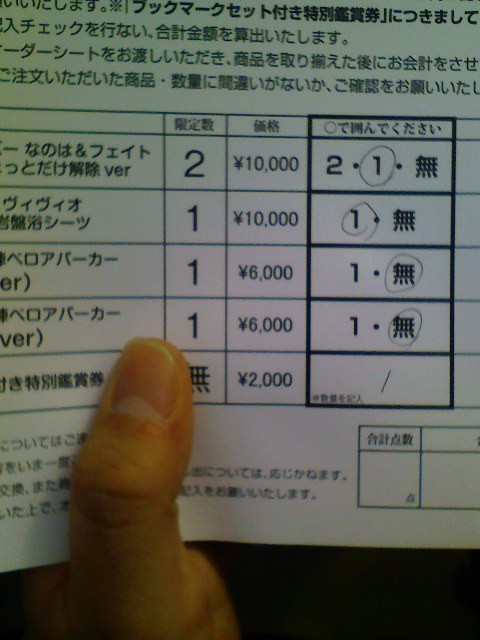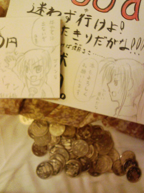 16:00 大井町東横イン 推 参 ! ・前日深夜 テンションあがって寝付けず。 軍資金の勘定をして落ち着く(上の写真) この後、一緒に泊まっているロスタブの孤漏尾が全裸で登場。 ノリノリで撮影会へ(そのときの写真は彼の許可が出たら掲載予定) ・一日目 午前四時にホテルを出発。 四時半に到着し、西口に並ぶ。(徹夜組の多さを嘆く、似た様なもんだが) そして10時。 開場!(パチパチパチパチパチ!!!!!) 何の迷いもなく行きずりの孤漏尾を連れなのはブースへ! 階段上からの写真。 手前に見えるはなのは、奥に見えるはビジュアルアーツ。 ここで、前にいたにいやんと仲良くなる。人って温かい。 とうとう紙が回ってくる(テンションマックス!) 売り切れと思われたシーツも残っている。神よ!!! ここで列の流れにより、にいやんと分かれる。 無事を祈った・・・ この後東に行き、少し島を巡って、知人のサークルを巡って終了。 ・2日目 今度は大井町を始発二番目くらいで出る。 到着すると東駐車場が満杯・・・・・・ 東方の狂気を思い知る(オレモナー) 開場後は真っ先に東方アレンジ 「堕武者グラインド」さん 書店委託で買えなかった分も含め、新作既作全部買い! ビビられる。 その後は島を流しながら、新規開拓に臨む。 今回は大手はメロンの委託で買うとして、島を攻めるのに重点を置いた。 苦しい資金繰りのせいである。 はやく世を忍ぶ仮の姿のほうで稼げるようにならんと・・・。 そのあとはコスプレ広場に行った。 新旧V3揃い踏み! 次回は自分もコスプレしようと誓う。 伝説の剣の前で、明日の無事を祈る。 ・3日目 今迄でおよそ、一番遅くホテルを出る。 7時ころ駅に到着。 人波に流されサークル入場者口で分岐。 皆が並ぶ中、お先に階段を上る。 げんしけんのくっちーのような感想は抱かず。 そして西館へ。 がらんとしたビックサイト。 なんとも言いようのない感動を覚える。 お金を準備しドキがマグマグ。 値札だけでは殺風景だったと反省する。 そして開場・・・・・・。 思ったより混まない西館。 あとで知人に聞くと東は地獄だった模様。 のんびりとした時間が過ぎる。 そして閉幕。 感動覚めやらぬテンションで後片付けに奔走。 設営を手伝えなかった分、片付けはちゃんとヤルぜ! して、岐路に着く大晦日・・・ 本当に、うまく言い様がないけど コミケはなんかすごくいいと思った、が感想でした 間違いなく、気力の続く限りは、参加します。 何物にも代えられない「快感」がある限りは、頑張れます。 当面の目標は そう 三月に控える 「しーむす2」 おしっこだけど いいじゃない、人間以外だもの。 PR