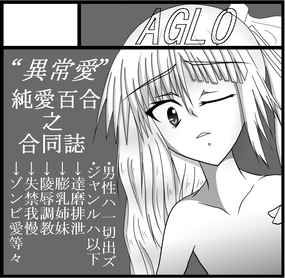 xxxxxx報告一xxxxxxxxxxxxxxxxxxxxxxxxxxx コミティア101参加申し込み完了 xxxxxxxxxxxxxxxxxxxxxxxxxxxxxxxxxxxxxxx 今回のサークルカットです(´∀` ) 今回も百合エロ本で御座います。 が、申し込みジャンルはえっち・アダルトでいきました。 内容は今回少し変わりまして、合同誌となります。 これはそのまま報告二につながりまして xxxxxx報告二xxxxxxxxxxxxxxxxxxxxxxxxxxx 新サークル「AGLO(アグロ)」発足 xxxxxxxxxxxxxxxxxxxxxxxxxxxxxxxxxxxxxxx 前々から企んでおりました、合同誌サークルを立ち上げました!(゜∀゜;)ムッハー!!! その名もAGLOで御座います(゜∀゜;)ムッハッハー!!!!! 知り合い、同人仲間をかき集めましたこのサークル。 百合エロ・百合アブノーマルを中心にみんなで創作していこうという主義です。 特定のメンバーは指定せず、その都度お願いして描ける方に描いて頂こうというスタンスで御座います。 今回は突根(つくね)ちょくなりさん、赤毛(あかげ)さん、木城翠(きじょうすい)さん、孤漏尾(これもび)さんにお願いいたしました。 内容もかなりハードコアになりそうで、ジャンルだけ並べても、スカトロ・失禁・ダルマ(四肢欠損)・ゾンビ百合・膨乳等々、このご時勢に沿った自制心溢れる感じで中々良さそうです(´∀`*) ただ、今回はまだ試験運用的な感じでして、反響、感想などで今後色々やり方を模索していく感じです。 なにはともあれ、コミティア101に向けただ今全力運転中です! とまあ色々ありまして。 他にも17日に行ってきたスマプリのなおれいオンリーの事などもあるのですが、如何せん長くなってきたので後はまた後日まとめようと思います。 あと、毎回恒例の夜歌さん主催のし~むす合同誌にも参加します! 今回も何時も通り百合お漏らしです。 とりあえずさっさと原稿あげないとね!!!